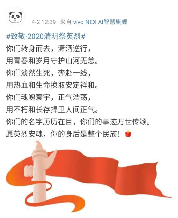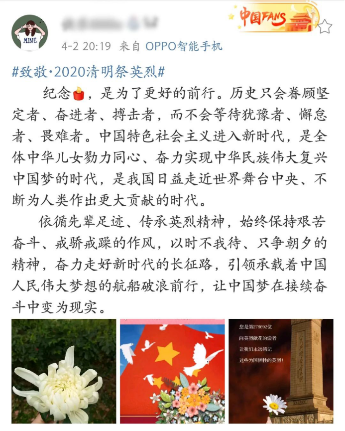 全体党员、入党积极分子利用微博平台积极发起“致敬·2020清明祭英烈”“清明祭英烈,我想对您说”等话题讨论,并邀请本团支部团员青年共同参加。字里行间表达对英烈的崇高敬意,展现出新时代青年将英烈精神融入生活实践的良好风貌,让英烈精神不断传承。