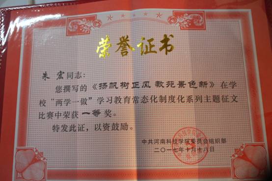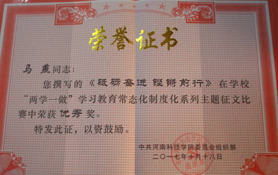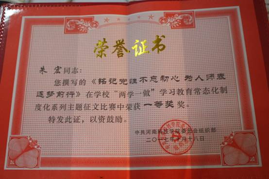 近期,我校在全体教工党员中开展了“两学一做”学习教育常态化制度化系列主题征文比赛。YG娱乐(中国)唯一官方网站 党委副书记朱宏荣获“学习焦裕禄”主题征文比赛一等奖、“学习黄大年”主题征文比赛一等奖,YG娱乐(中国)唯一官方网站 教师马燕荣获主题征文比赛优秀奖。