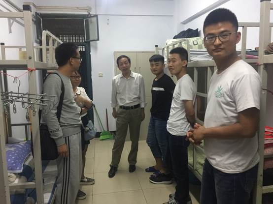 孟书记查看了新生们的住宿环境及宿舍安全状况,以确保新生们住的安心;与新生们进行亲切的交谈,询问了新生们对宿舍环境、居住条件是否适应,并对新生的家庭状况和进行了相应的了解。