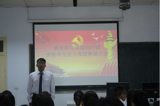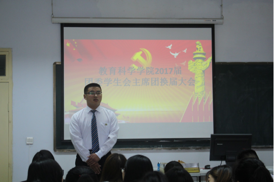于教学技能实训室举行了2017届团委学生会主席团换届大会。参与此次大会的有团委书记熊慧娟、团委副书记李威、辅导员卢璐洁、2016届团委学生会主席团成员、各部室部长及各班学生代表。