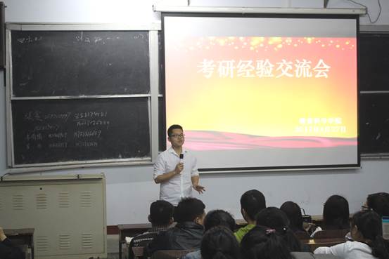 今年成功考取研究生的10名同学依次上台就“为什么要考研、如何选择学校、专业课应该如何复习”等问题为现场的同学做了详细讲解。考取河北大学的张赛同学还结合自身经验分享了英语学习的技巧,提到要努力调节好自身的情绪、适当逼自己一把。