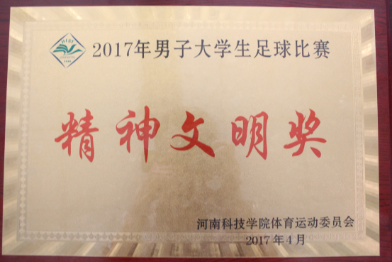 日前,河南科技YG娱乐 2017年男子大学生足球赛圆满落下帷幕。本次比赛从3月开始,在院团委、学生会的积极动员和精心组织下,YG娱乐(中国)唯一官方网站 参赛队员们秉承“友谊第一,比赛第二”的原则,凭借足球赛期间精彩的表现荣获精神文明奖。
