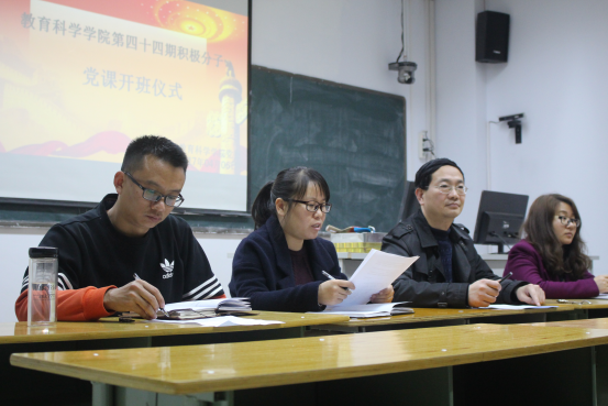 在老图书馆四楼教学技能训练室举行了第四十四期入党积极分子党课开班仪式。院党委书记孟景舟、党委副书记朱宏、院团委书记熊慧娟、团委副书记李威、辅导员卢璐洁及第四十四期入党积极分子参加了开班仪式。