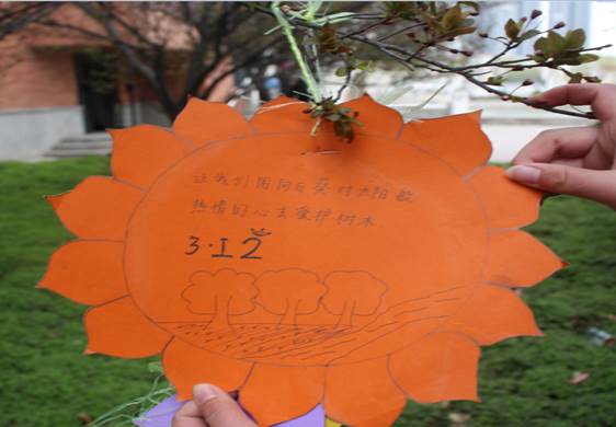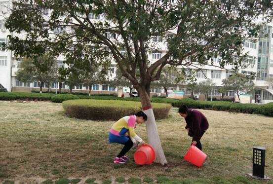 此次活动共分为为树木浇水和悬挂环保卡片两部分。上午九点,志愿者们带着提前准备好的水桶、卡片等工具在系办一楼集合。随后一起为校园中的树木浇水,滋润新生的树苗。同时在树枝中挂上提前制作的环保卡片,卡片上承载着大家的祝愿,呼吁人们爱护植物。