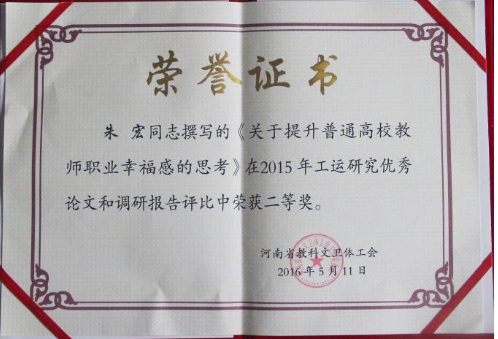 日前,从河南省教育工会获悉,YG娱乐(中国)唯一官方网站 教师朱宏在2015年全省教育系统工运研究优秀论文和调研报告评比活动中,表现突出,荣获二等奖。