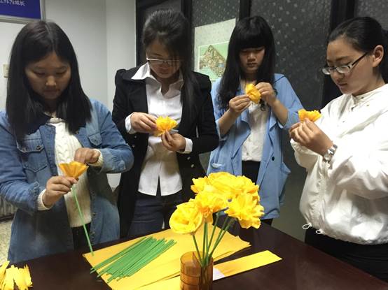 学前教育专业4名学生,发扬勤俭节约精神亲手制作用来祭奠先烈的纸花。叠纸、剪纸、捆丝、捋花……每一个制作环节、每一朵圣洁的花儿,都凝聚着学生们对先烈的一片哀思之情,一份缅怀之意。