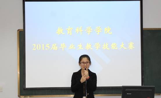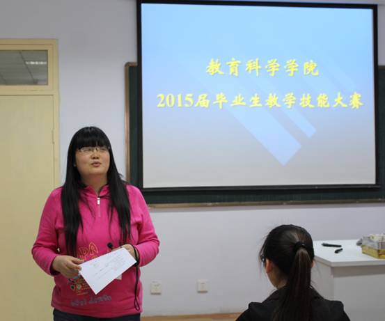 有8位同学参加了本次比赛,比赛分为说课、特长展示、答辩三个环节。比赛中,各参赛同学从教学目标、重难点、教学学法、教学手段、教学程序、课后反思等几个部分对课程进行了全面的分析。参赛同学的说课准备充分,教学理念理解透彻,教材分析到位,学情把握准确,符合新课改精神,表现出了较强的教材处理能力和清晰的教学思路。特长展示环节形式多样化,配乐诗朗诵、瑜伽表演、葫芦丝独奏等等。在答辩中参赛选手沉着、冷静、自然、大方,语言表达流畅,充分展示了扎实的教学基本功和较强的临场应变能力。经过激烈角逐,姜小娇、杜宇飞、王春燕3位同学荣获一等奖。获奖选手将参加学校举办的师范毕业生教学技能大赛。