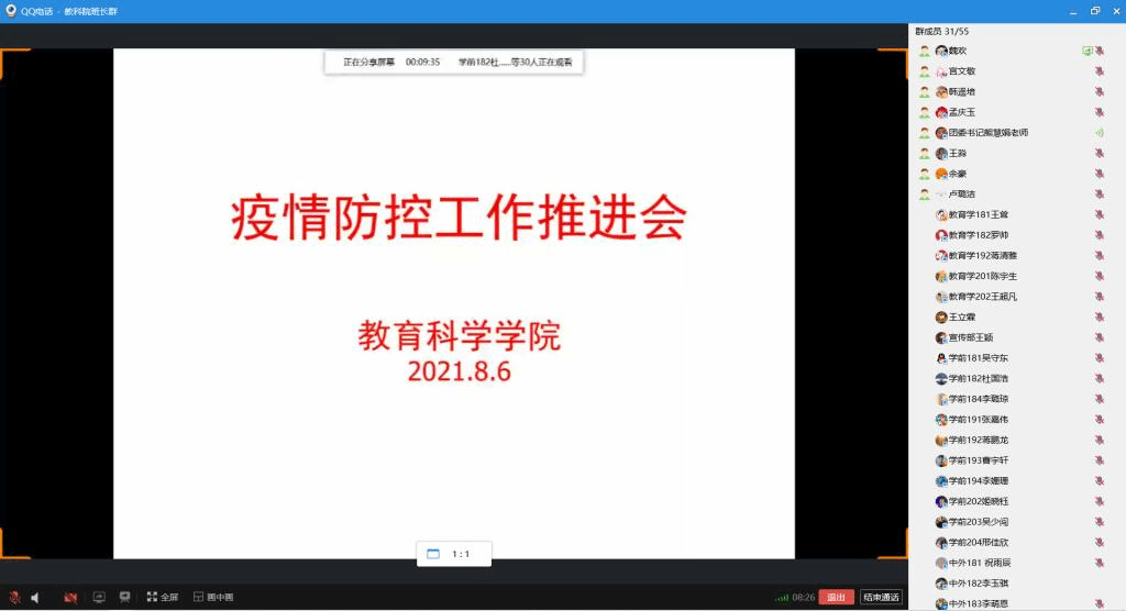 召开线上疫情防控工作推进会,团委书记熊慧娟、团委副书记卢璐洁、辅导员张钊铭、王立霖、主要学生干部及各班班长参加此次会议。会议由熊慧娟主持。