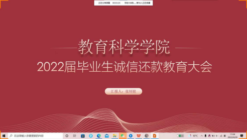 资助专管员张钊铭于线上主持召开2022届贷款毕业生诚信还款教育会议。2022届贷款毕业生和团委综合资助部学生出席本次会议。