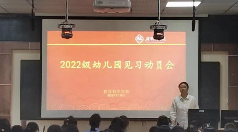 在老图书馆四楼教学技能训练室召开2022级幼儿园见习动员会。本次会议由杨丽君主持,7位指导教师及2022级学前教育专业全体学生参加动员会。
