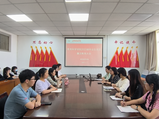 在零号楼十楼会议室召开2023届毕业生党员廉洁教育大会。学生第一党支部书记卢璐洁、学生第二党支部书记熊慧娟和2023届毕业生党员参加会议。