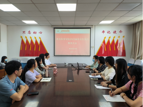 会议室召开2023届毕业生党员教育大会。学生第一党支部书记卢璐洁、学生第二党支部书记熊慧娟及2023届全体毕业生党员参加会议。