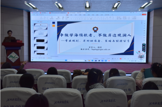 会上,胡平以“争做学海领航者,不做岸边观澜人”为题,就制定大学规划、学习经验分享、备战考研考博策略三个方面进行了分享。她结合自身的求学和工作经历,说明了制定大学规划、培养学习习惯的重要性。希望同学们能够尽早明确奋斗目标,找到努力方向,不虚度大学四年的美好时光,同时要利用好日常学习中的教学资源,多向老师请教交流,以积极的态度提高自身专业水平,为今后人生道路打下坚实基础。最后,胡平介绍了考研、考博的实用技巧,备战经验,并就学弟学妹们的疑惑进行逐一解答。分享内容精彩生动,真实感人,在座同学们受到极大启发和鼓舞,现场掌声不断。