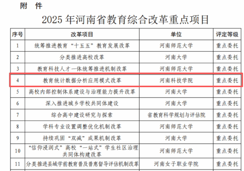 近日,河南省教育厅办公室印发《关于做好2025年教育综合改革重点项目管理工作的通知》(教办发规〔2025〕215号),公布了2025年河南省教育综合改革重点项目名单,我校高等教育研究所承担《教育统计数据分析应用模式改革》,实现我校在该类项目中的历史性突破。